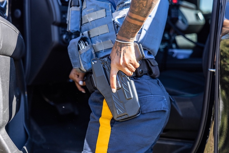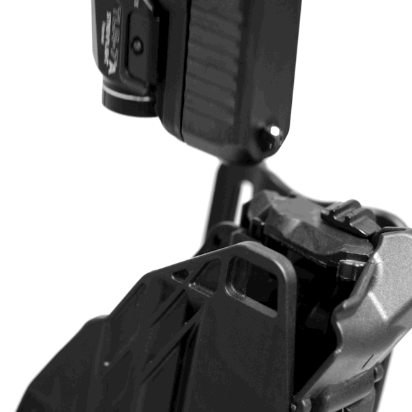 Full Containment Locking System — For those who demand top-tier security, the Duty Holster offers up to a Level 4 retention with an auto-locking lever and thumb-activated locking block guard. Agencies have the option to utilize either a manual or automatic lock block guard, which secures the locking lever (ILS) for enhanced retention. The Full Containment ILS locks on the outboard side of the holster’s pass-through window, adding greater security.